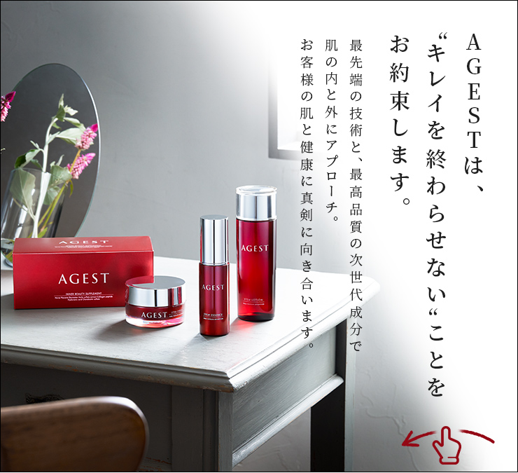 商品紹介PRODUCTS 商品一覧Products インナービューティーサプリメント詳細 ストーリーSTORY 「キレイを終わらせない」 いつも自分に正直でいること ときには自分を甘やかすこと でもときには我慢も必要 今この瞬間を楽しむこと 美しいものを愛し、自分を愛すること。 タブロイドTABLOID もっと見る 開発秘話PRODUCTS STORY AGEST開発の裏話や商品開発者が商品に込めた想いまで。エイジングケアの知識を深めるコンテンツです。 もっと見る
